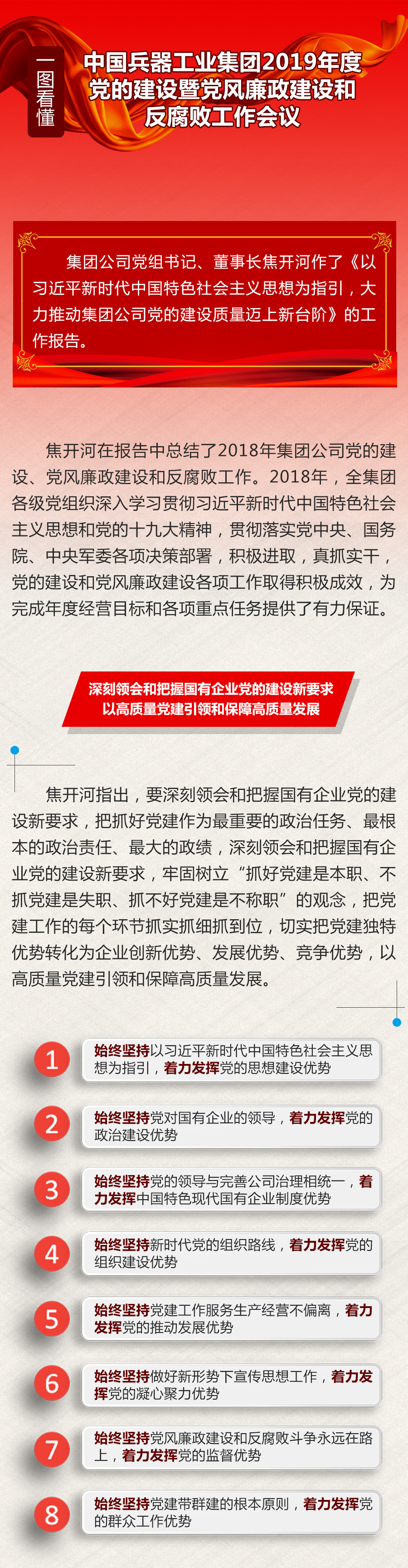 焦開河指出,要深刻領會和把握國有企業(yè)黨的建設新要求,以高質量黨建引領和保障高質量發(fā)展。要始終堅持以習近平新時代中國特色社會主義思想為指引,著力發(fā)揮黨的思想建設優(yōu)勢;始終堅持黨對國有企業(yè)的領導,著力發(fā)揮黨的政治建設優(yōu)勢;始終堅持黨的領導與完善公司治理相統(tǒng)一,著力發(fā)揮中國特色現(xiàn)代國有企業(yè)制度優(yōu)勢;始終堅持新時代黨的組織路線,著力發(fā)揮黨的組織建設優(yōu)勢;始終堅持黨建工作服務生產經(jīng)營不偏離,著力發(fā)揮黨的推動發(fā)展優(yōu)勢;始終堅持做好新形勢下宣傳思想工作,著力發(fā)揮黨的凝心聚力優(yōu)勢;始終堅持黨風廉政建設和反腐敗斗爭永遠在路上,著力發(fā)揮黨的監(jiān)督優(yōu)勢;始終堅持黨建帶群建的根本原則,著力發(fā)揮黨的群眾工作優(yōu)勢。