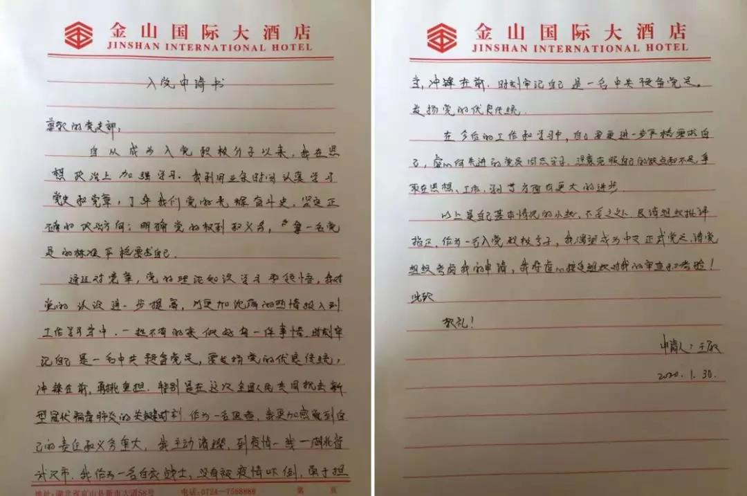 1月30日,在武漢戰(zhàn)“疫”第一線,短短的兩天,讓青年護士王敏、王曉霞最驚訝、最感動的就是防控疫情黨員先行,最危急的關(guān)頭、最危險的地方總有共產(chǎn)黨員沖在前面,“我是黨員我先上”成為最響亮的口號。到達(dá)武漢的第二天,她們就向內(nèi)蒙古衛(wèi)健委成立的援助武漢臨時黨支部遞交了入黨申請書。她們表示,要在武漢防疫一線努力工作,向黨員同志學(xué)習(xí)、看齊,以實際行動早日成為一名正式的共產(chǎn)黨員!