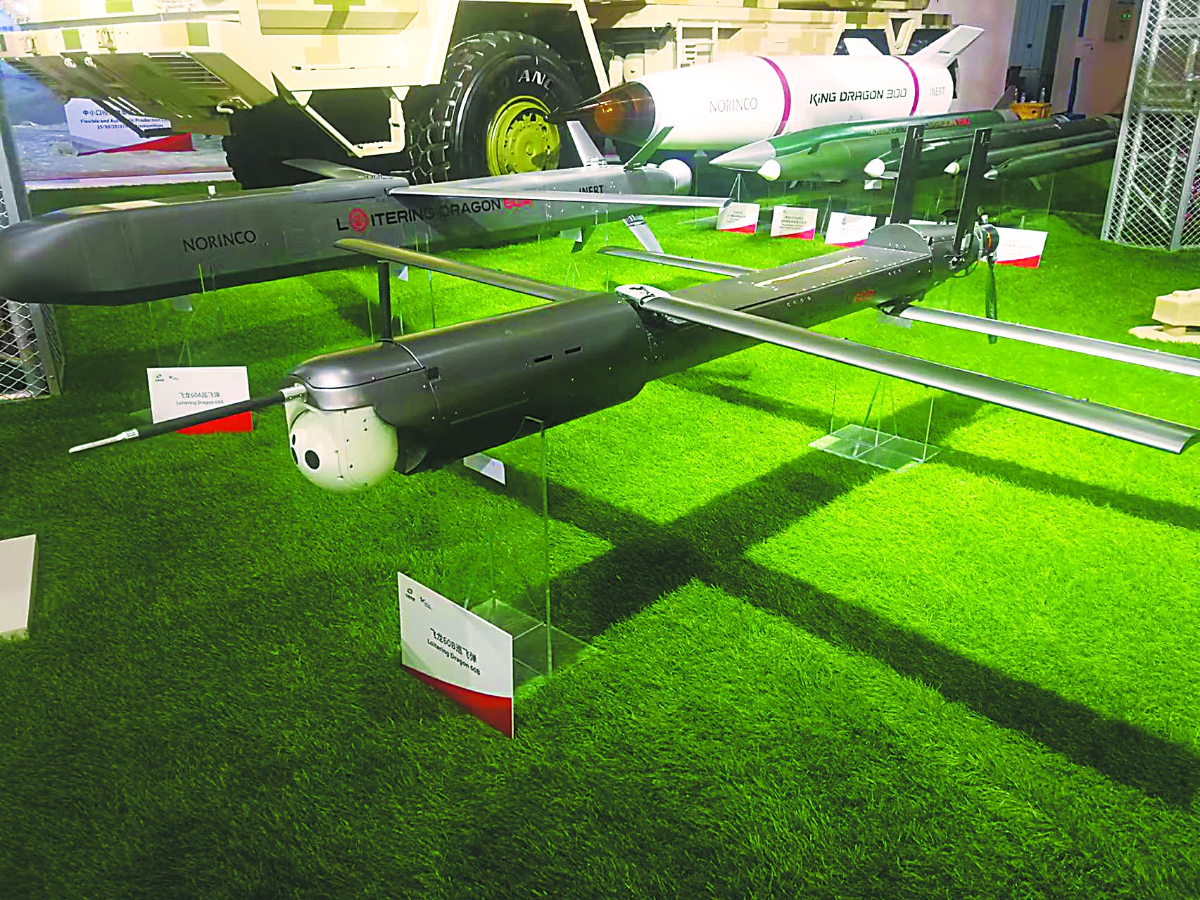 兵器工業(yè)集團展出的SR-5遠程火箭炮系統(tǒng)被稱為“中國版‘海馬斯’”,它的特點之一就是能共架發(fā)射“飛龍-60”巡飛彈,從而引導(dǎo)火箭炮對數(shù)百公里外目標的遠程精確打擊。