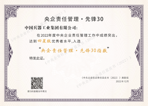 12月20日,由國(guó)務(wù)院國(guó)資委社會(huì)責(zé)任局主辦、中國(guó)社會(huì)責(zé)任百人論壇承辦的“新征程新責(zé)任——《中央企業(yè)社會(huì)責(zé)任藍(lán)皮書(shū)(2022)》《國(guó)資國(guó)企社會(huì)責(zé)任藍(lán)皮書(shū)(2022)》發(fā)布活動(dòng)”在京召開(kāi),國(guó)務(wù)院國(guó)資委黨委委員、秘書(shū)長(zhǎng)彭華崗出席并講話?!侗鞴I(yè)集團(tuán)堅(jiān)定不移推進(jìn)綠色低碳發(fā)展》作為優(yōu)秀案例入選《中央企業(yè)社會(huì)責(zé)任藍(lán)皮書(shū)(2022)》,充分展示了兵器工業(yè)集團(tuán)在綠色低碳發(fā)展方面的責(zé)任擔(dān)當(dāng)和履責(zé)成效。同時(shí),兵器工業(yè)集團(tuán)責(zé)任管理達(dá)到四星級(jí)優(yōu)秀者水平,成功入選“央企責(zé)任管理·先鋒30指數(shù)”?!把肫筘?zé)任管理·先鋒30指數(shù)”是對(duì)中央企業(yè)在責(zé)任組織、責(zé)任融合、責(zé)任溝通等方面的建設(shè)情況進(jìn)行綜合評(píng)價(jià)的專項(xiàng)指數(shù),為今年首次發(fā)布。