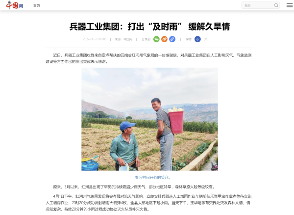 5月27日,中國網刊發(fā)《兵器工業(yè)集團:打出“及時雨” 緩解久旱情》,對中國兵器工業(yè)集團有限公司助力云南省紅河州人工影響天氣、氣象監(jiān)測建設等方面作出的突出貢獻作了報道。 兵器工業(yè)集團:打出“及時雨” 緩解久旱情 近日,兵器工業(yè)集團收到來自定點幫扶的云南省紅河州氣象局的一封感謝信,對兵器工業(yè)集團在人工影響天氣、氣象監(jiān)測建設等方面作出的突出貢獻表示感謝。 原來,3月以來,紅河縣出現了罕見的持續(xù)高溫少雨天氣,部分地區(qū)特旱,森林草原火險等級較高。 4月1日下午,紅河州氣象局發(fā)現將會有強對流天氣影響,立即安排兵器造人工增雨作業(yè)車輛前往樂育甲寶作業(yè)點等待實施人工增雨作業(yè),21時20分成功發(fā)射增雨火箭彈4枚,全縣大部地區(qū)下起小雨。當天下午,寶華與樂育交界處突發(fā)森林火情,情況較復雜,持續(xù)20分鐘的小雨過程成功協助滅火隊員撲滅火情。